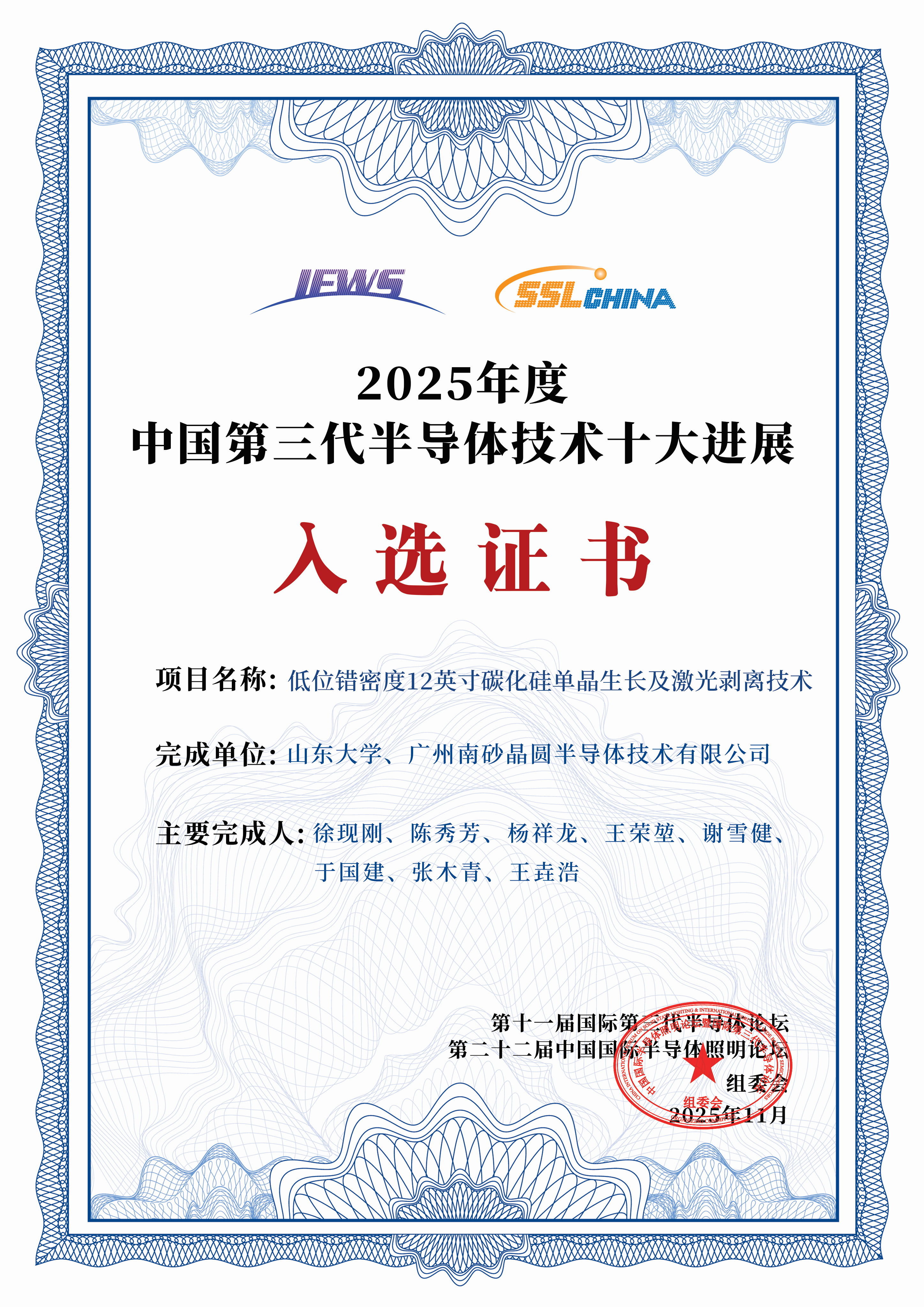 “低位错密度12英寸碳化硅单晶生长及激光剥离技术”入选“2025年度中国第三代半导体技术十大进展”。
