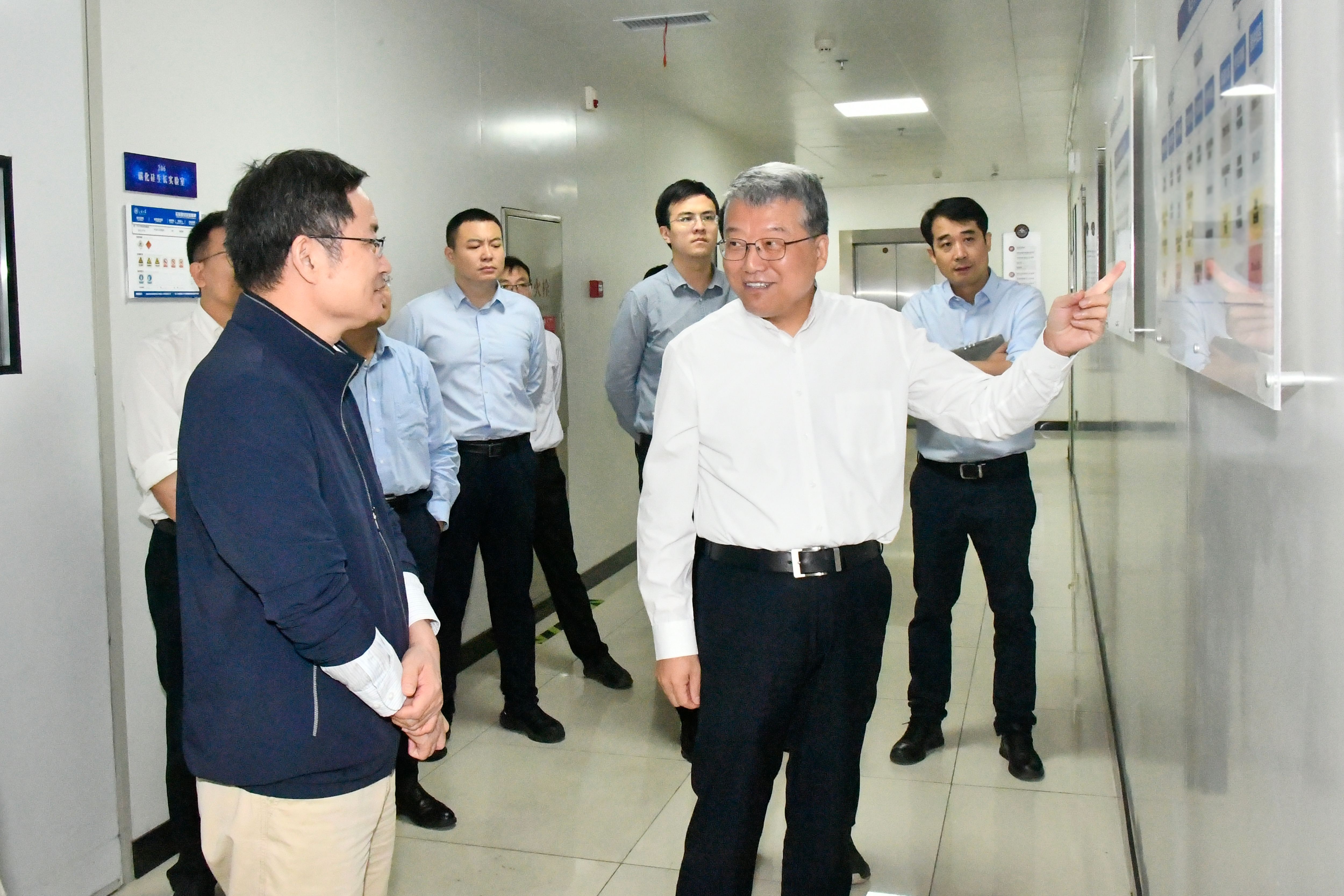 9月25日,科技部原副部长李萌来成人视频 新一代半导体材料集成攻关大平台调研参观。成人视频 党委书记郭新立、集成攻关大平台主任徐现刚等陪同调研,成人视频 党委常委、副校长易凡汇报学校发展及外国专家有关工作。